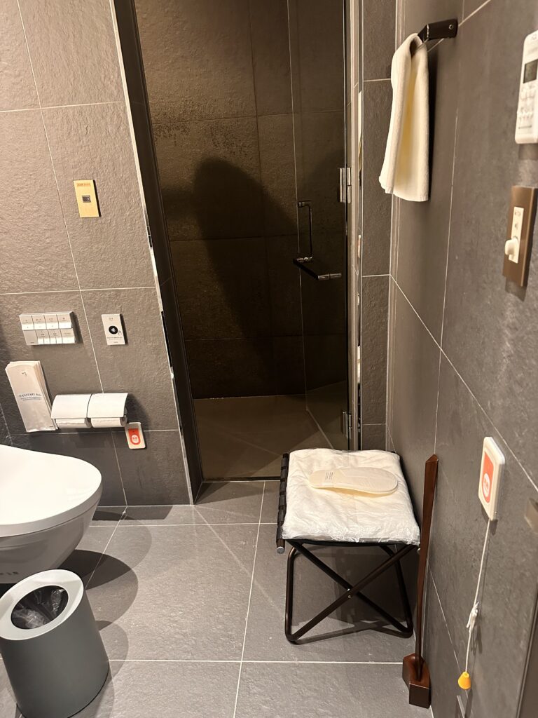 椅子や荷物置きのスペースもあり、機内持ち込みサイズのスーツケースならギリギリ広げられるくらいの余裕はありそうです。 (私はいつもスーツケースを預ける派なので実際には広げていませんが、たぶん大丈夫そうな印象でした。)