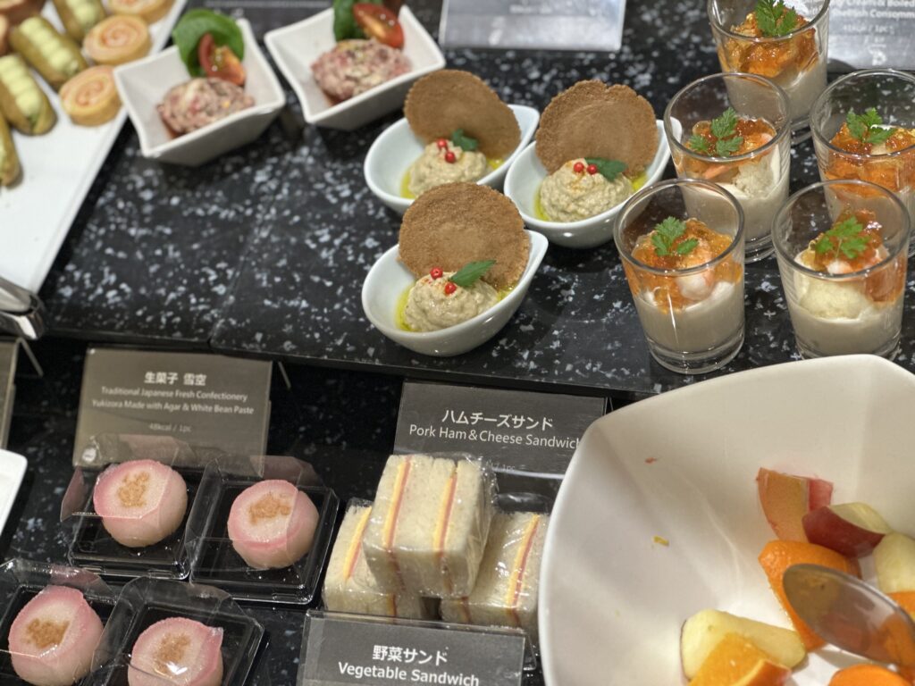 ラウンジ内には、アミューズやサラダ、パン、おにぎり、フルーツ、デザートなどが並ぶビュッフェコーナーがあります。 軽めのものを少しずつ楽しめる内容で、「がっつり食べる」というよりは、上品につまむスタイル